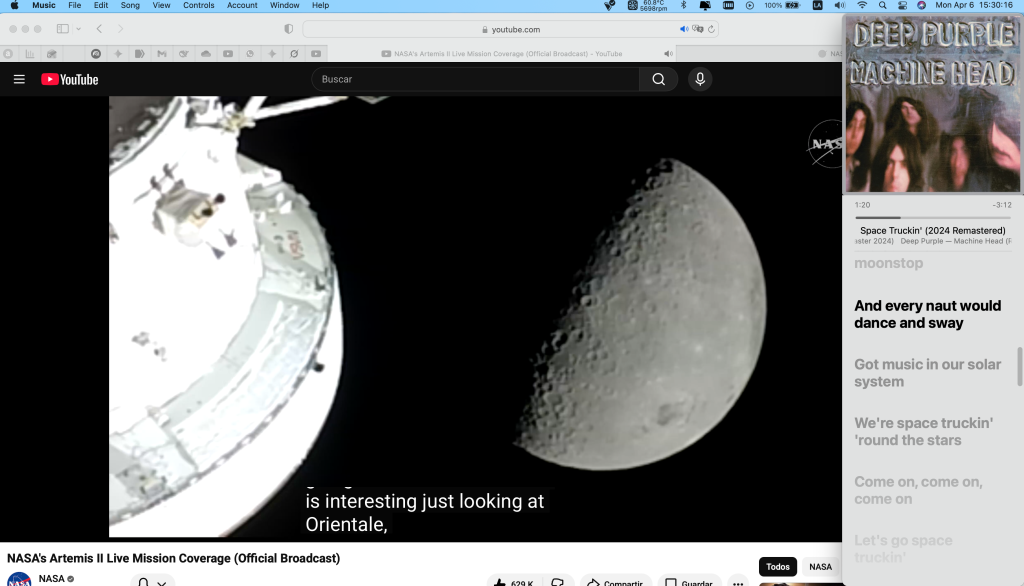 Por lo mientras seguiré la misión en tiempo real acompañado de la música psicodélica cavernaria de cuando estaban vigentes las misiones Apollo, acompañada de actualidad: «Got music in our solar system…«